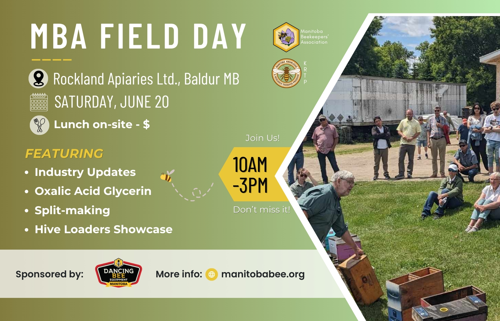 This annual event is free and open to the public, with the goal of raising awareness about pollinator habitat and the crucial role bees play in sustainable agriculture. We appreciate our supporters, including: BeeMaid Honey, Dancing Bee Equipment, BeeU at Brandon University, KRTP, and McKenzie Seeds.